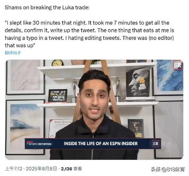 在參加《Sports Reporters》節(jié)目中,Shams談推特報道濃眉東契奇交易的細(xì)節(jié):“那天晚上,我大概只睡了大概30分鐘。我花了7分鐘時間收集所有細(xì)節(jié)、確認(rèn)信息,然后寫好那條推文。最讓我難受的是推文中出現(xiàn)了錯別字,我討厭修改推文。當(dāng)時(沒有編輯)在我旁邊?!?/p>