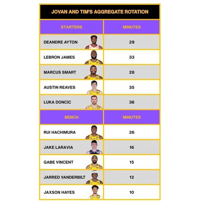 昨日,根據(jù)ESPN媒體報道,湖人預計會在明年夏天為里夫斯提供一份年薪3000萬的續(xù)約合同,以讓其長期跟東契奇搭檔,自此,湖人這個休賽期的操作,以及未來的核心搭建框架基本確定,球迷們在這個夏天所關心的問題也基本給出了答案,現(xiàn)在唯一的問題就是,湖人在新賽季的陣容輪換到底應該是什么樣的?對此,NBA記者Jovan Buha更新社交媒體,曬出對于湖人新賽季輪換時間的預測。