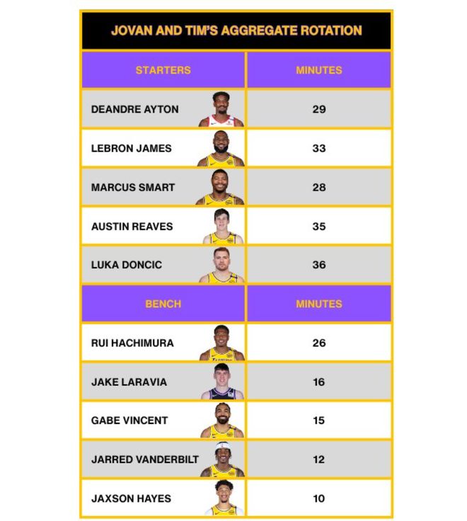 北京時(shí)間10月8日,湖人記者約什-布哈在個(gè)人的播客節(jié)目中談到了25-26賽季潛在的湖人10人輪換時(shí)間,他做出了多鐘的分析安排,我覺得比較好的是:艾頓29分鐘、詹姆斯33分鐘、斯馬特28分鐘、里夫斯35分鐘、東契奇36分鐘、八村壘26分鐘、拉拉維亞16分鐘、文森特15分鐘、范德比爾特12分鐘,海斯10分鐘。